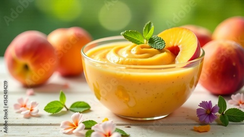 Peach smoothie bowl with mint on light wooden background