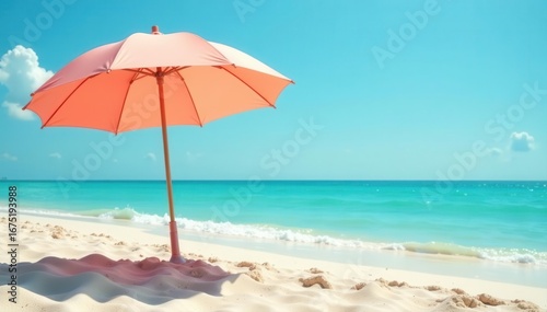 Peach-colored umbrella nestled in soft sand, gentle breeze , rest, getaway