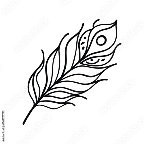 Peacock feather doodle line vector illustration, hand drawn decorative sketch, elegant boho art design