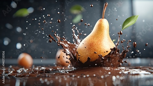 Pear splashing into rich chocolate, with high-detail droplets captured.