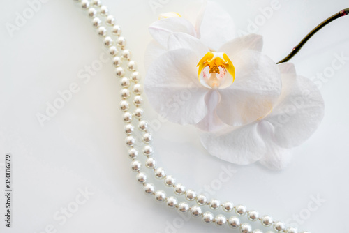 pearl and white orchid on a white glas