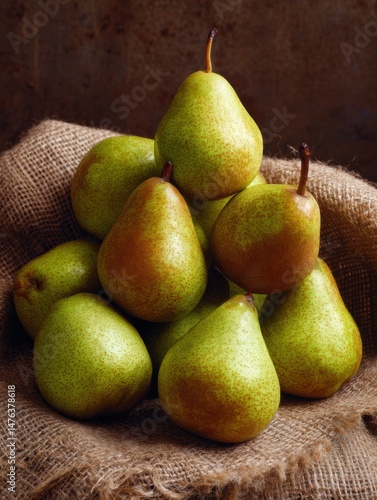 Pears Arranged in a Pyramid on Burlap Fabric in a Cozy Setting During Daylight