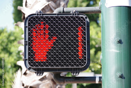 Pedestrian crosswalk traffic signal with red hand warning only one second left for crossing