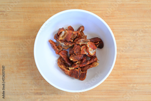 Peeled tamarind in white bowl on bamboo wooden background, preparation process of tamarind for cooking. Top view.