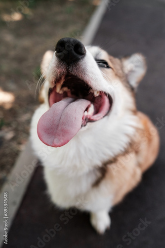 Pembroke Welsh Corgi dog on a sunny day. Sits and looks to the side, sticking out his tongue. Close-up of the tongue. Happy little dog. Concept of care, animal life, health, show