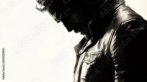 Pensive Man in Leather Jacket Dramatic Silhouette Monochrome Portrait