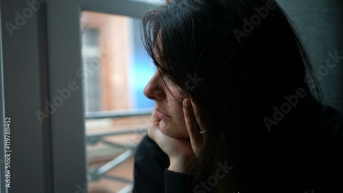 Pensive melancholical woman looking out window thinking