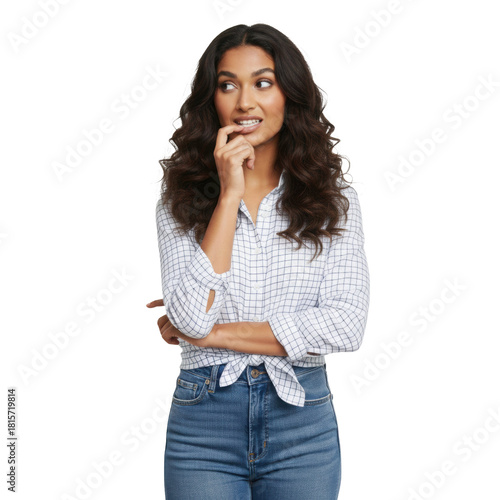 Pensive South Asian woman considers ideas and future plans, isolated on transparent background
