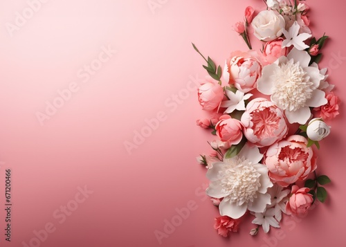 Peonies, roses on pink background with copy space