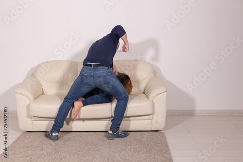 people, abuse and violence concept - aggressive man hitting his wife on sofa
