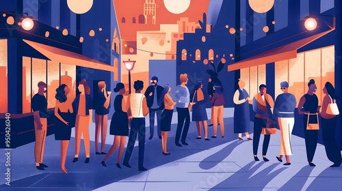 People Gathering in City Street at Dusk Illustration