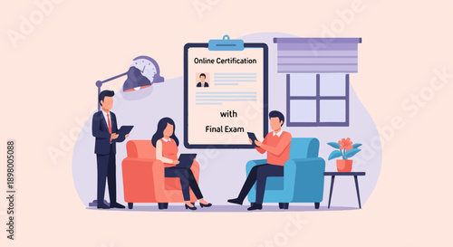 People in a room interacting with a digital certificate display with a final exam note