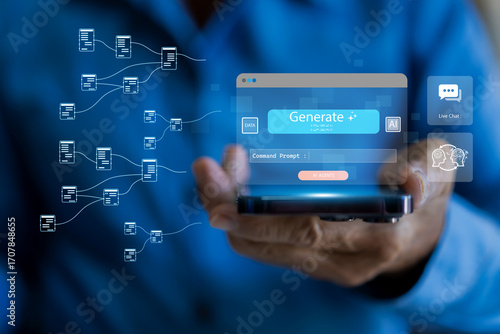 People interacting with AI interface to generate content using command prompt and virtual tools, concept of artificial intelligence, ai generative technology, automation and smart digital agents