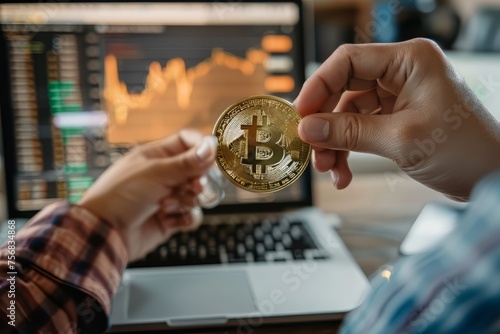 People showing bitcoin on laptop computer. Cryptocurrencies. Business