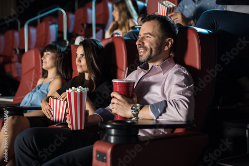 People watching a movie and eating popcorn