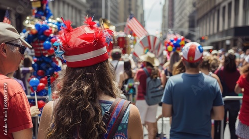 People watching an Independence Day parade with marching bands and floats