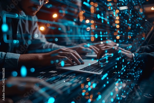 People working on laptops in dimly lit room