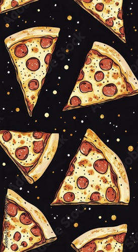 Pepperoni pizza slices floating on black cosmic backdrop with scattered dots