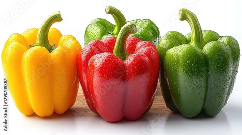 Peppers Resting Assorted colors on a wooden cutting board against a plain white backdrop