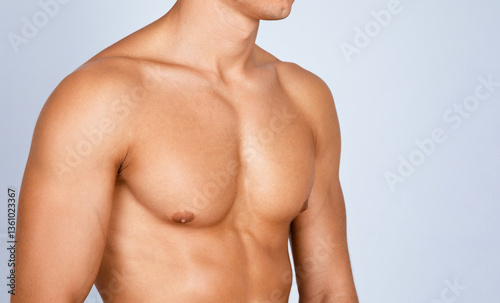 Perfect Fit Body. Closeup of unrecognizable strong athletic guy with muscular naked torso showing his chest, isolated over gray background. Shirtless man with attractive breast posing at studio