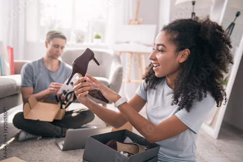 Perfect style. Pleasant cheerful woman smiling while looking at her new shoes
