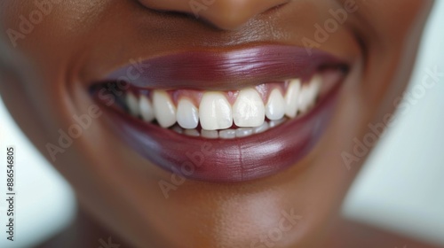 Perfect white teeth African American black girl close up. Female toothy veneer smile. Dental care and stomatology