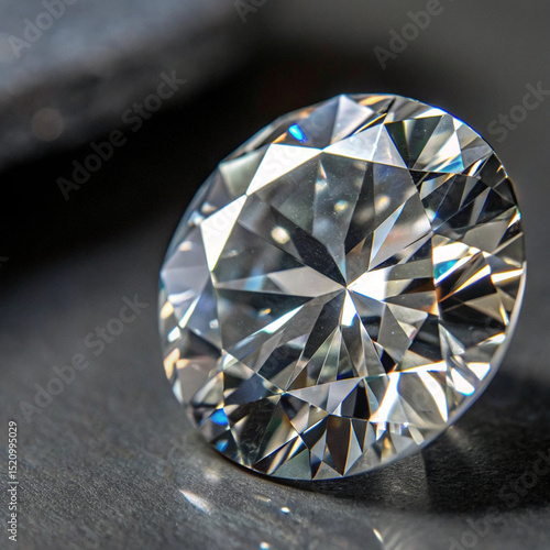 Perfectly faceted round brilliant diamond with 58 facets catching studio lights, extreme macro