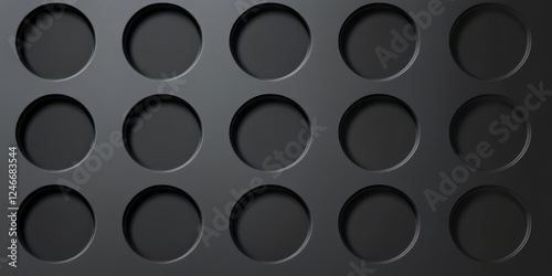 Perforated black metal mesh background with symmetrical circular holes creating a geometric pattern. The high-tech industrial design provides a modern, edgy feel, ideal for futuristic electronics or
