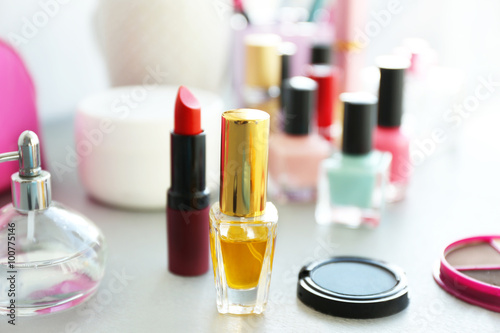 Perfume bottle with makeup cosmetics on a table
