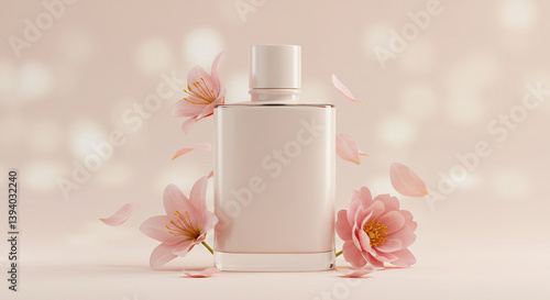 Perfume Bottle with Pink Flowers and Petals on Soft Background