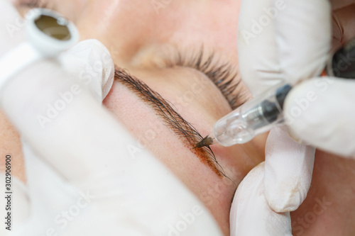 Permanent makeup, tattooing of eyebrows. Cosmetologist applying make up