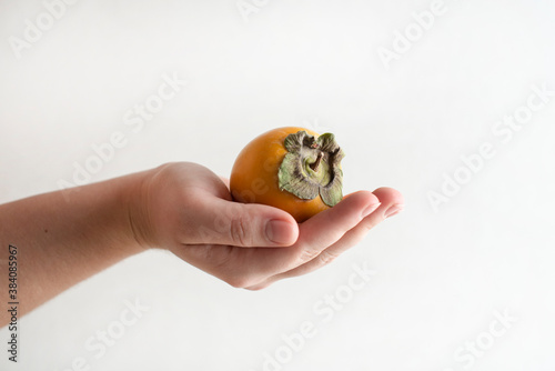Persimmon in hand on white background