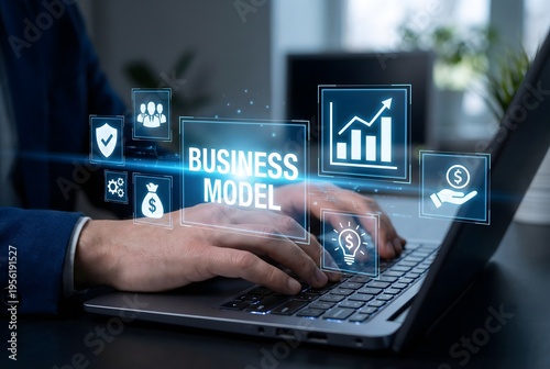 Person actively types on a modern laptop, engaging with a holographic display of "business model" surrounded by various essential icons.