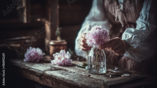 Person Arranging Pink Peony Flowers in Glass Vase on Rustic Wooden Table