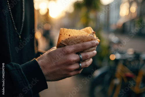 person eating sandwich on city street holding food in hands blurred bicycles background concept of fast food culture and urban dining