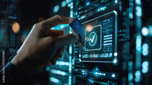 Person ensuring a secure online payment with a credit card via a digital interface, verification tick symbol, fintech, internet banking