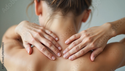 Person giving themselves a neck massage against a soft background