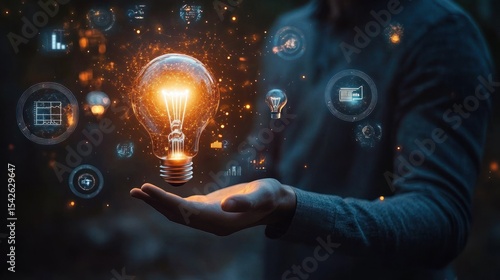 Person holding a glowing light bulb surrounded by floating digital icons and smaller light bulbs symbolizing ideas and innovation in a dark environment
