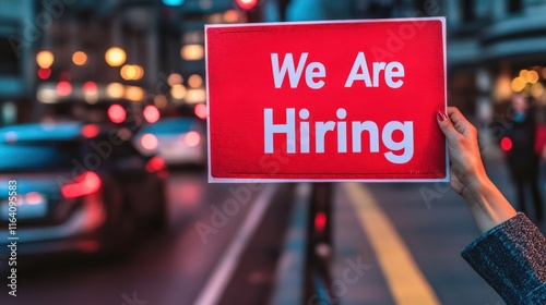 Person Holding a Red Sign with the Text "We Are Hiring" Amidst Busy Urban Traffic During the Evening, Signaling Job Opportunities in a Modern City Environment