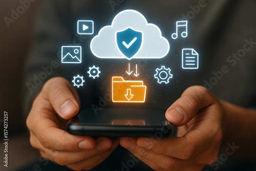 Person holding smartphone displaying cloud storage and data download graphic interface concept art