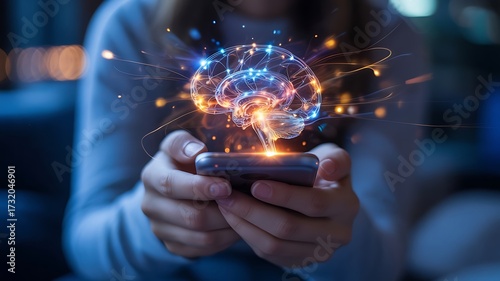 Person holding smartphone with glowing brain hands
