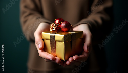 Person holds a gold gift box and colorful ornament against a dark background to depict Christmas and New Year celebrations._00001_