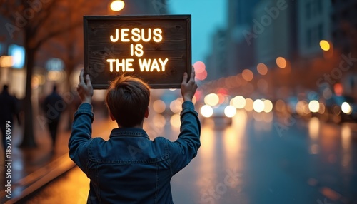 Person holds illuminated sign with text Jesus is the Way in city street at night. Passerby walk on wet pavement near traffic. Symbol of faith and hope.