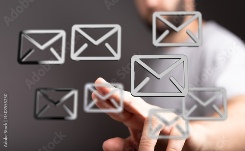 Person interacting with digital email icons. Concept for email management, inbox organization, and digital communication.
