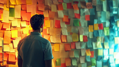 Person looking at colorful sticky notes wall arrangement in rainbow order