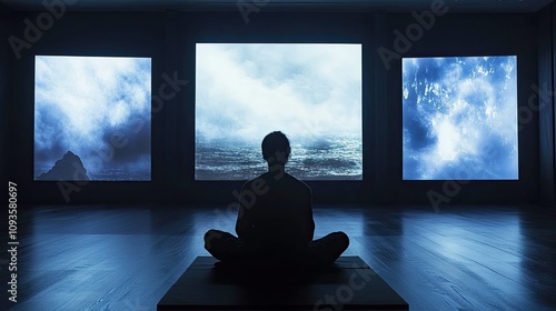 Person Meditates Before Three Serene Seascapes