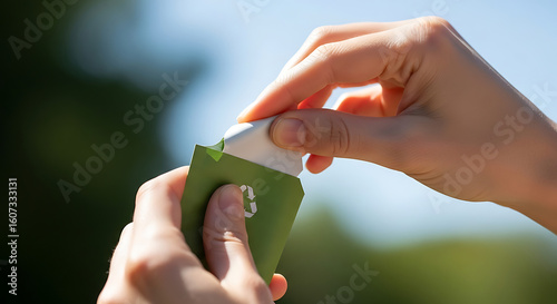 Person opening a small green package with a recycle symbol outdoors in natural light with soft focus on transparent background