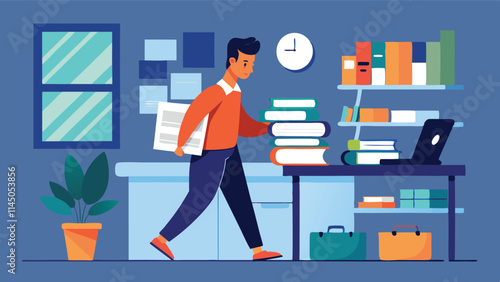Person organizing books and files in a modern office environment during daytime in a calm workspace