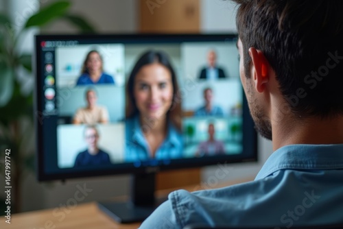 Person Participating in Online Interview or Webinar with Video Conference Icons and E-Learning Materials Displayed on Computer Screen