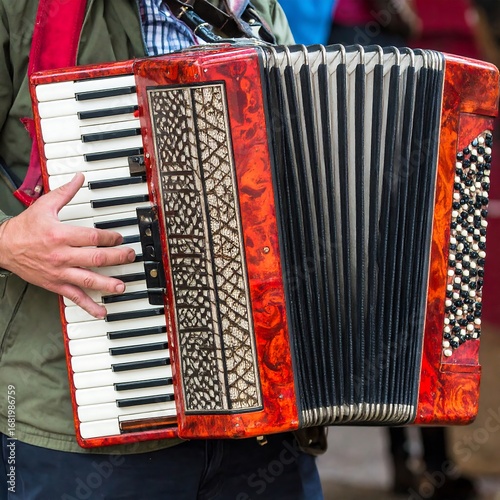 Person playing a red accordion